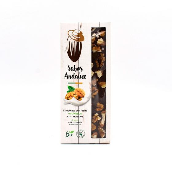 Chocolate con leche ecológico y trozos de nuez, elaborado con aceite de oliva virgen extra. Todos los ingredientes utilizados para su fabricación provienen de la agricultura ecológica y no contiene ni gluten, ni conservantes, ni colorantes.