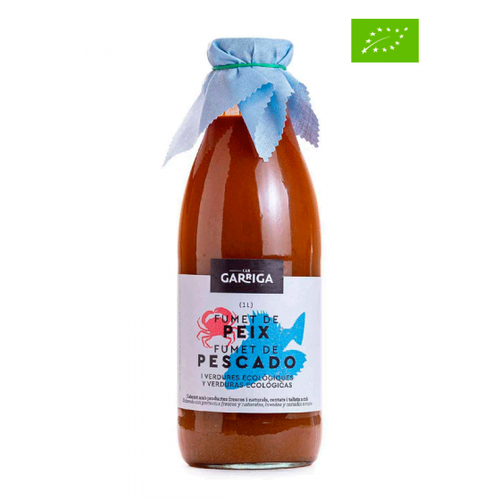 Caldo de pescado de Can Garriga. Caldo listo para consumir elaborado mediante la cocción de pescado y verduras frescas ecológicas. Para comer como primer plato, solo o añadiendo arroz o pasta.