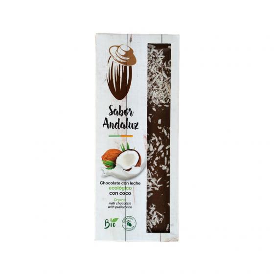Chocolate con leche ecológico y coco rallado, elaborado con aceite de oliva virgen extra. Todos los ingredientes utilizados para su fabricación provienen de la agricultura ecológica y no contiene ni gluten, ni conservantes, ni colorantes.